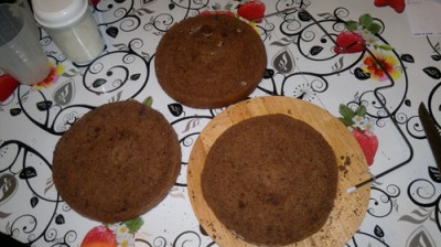 Затем проводим ножом вдоль стенок и выкладываем бисквит на стол. Разрезать корж на 3 части. Перемазать кожи вареной сгущенкой (можно сгущенку взбить со сливочным маслом (150 г) или со сметаной). Верхний корж не надо мазать кремом. Его зальем шоколадной глазурью и в центр насыпем немного орехов. Ждать пропитки не нужно, можно есть сразу.