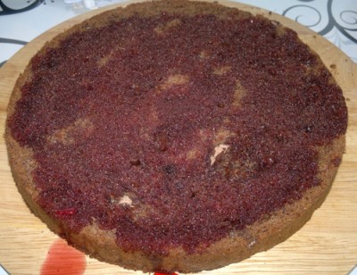 4. Бисквитный корж разрезать пополам. Нижний корж положить на песочный корж и слегка прижать. Сбрызнуть 2 ст.ложками вишн. водки.