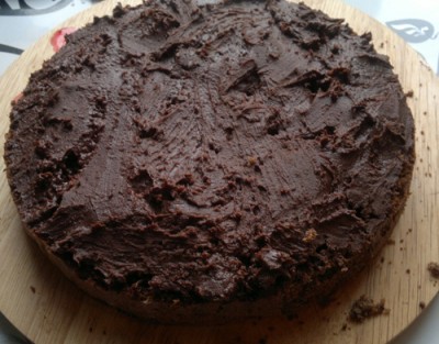 Сверху заливаю глазурью, по рецепту не было - растапливаю шоколад с маслом и молоком (либо сливками) и когда пирог готов - заливаю сверху. Для глазури надо 100-120 гр шоколада, 10-20 гр. масла и 50 мл молока. Нужно чтобы было густо, но чтобы растекалось. Все растапливаем на водяной бане.