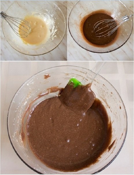 Для теста:Мука ~ 150 г Яйца - 3 штуки Сахар - 100 г Ванильный сахар - 1 столовая ложка Соль - щепотка Шоколад - 100 г Какао - 3 столовые ложки Крахмал - 2 столовые ложки Разрыхлитель - 1 чайная ложка Молоко - 100-150 мл