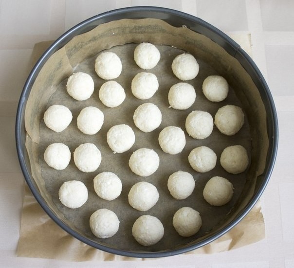 Для шариков из творога:Творог - 250 г Мука - 3 столовые ложки Яйцо - 1 штука или 2 желтка Сахар - 50 г Кокосовая стружка - 40 г