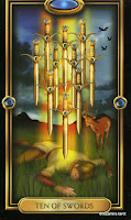 10 мечей. Ох ну что то второй день подряд у на Вас выходит карта с не оч позитивным фоном Усталость, чувство потери...возможно состояние,словно квашенная капуста))), но свет есть,главное не стоить на завтра планировать много дел,дабы не переутомиться, можете отдохнуть, еще будет лучше отпустить некие мысли разрушающего характера...они Вам ой как мешают.